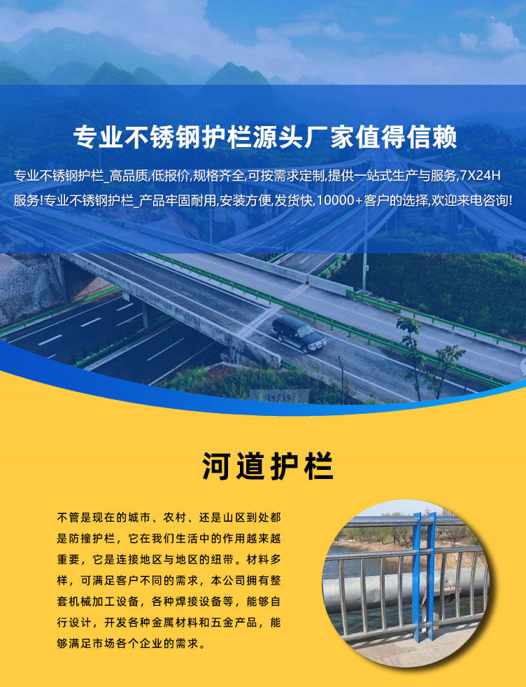 河道護欄不僅具有不銹鋼管的豪華美觀和現(xiàn)代氣息,又具有普通碳鋼管的堅韌性。是價昂不銹鋼管的替代品,它與鋼板立柱配合,做成城市、道橋等的安全欄桿。 不僅牢固、大方,且可造型各異,給都市別一種亮麗風景線。